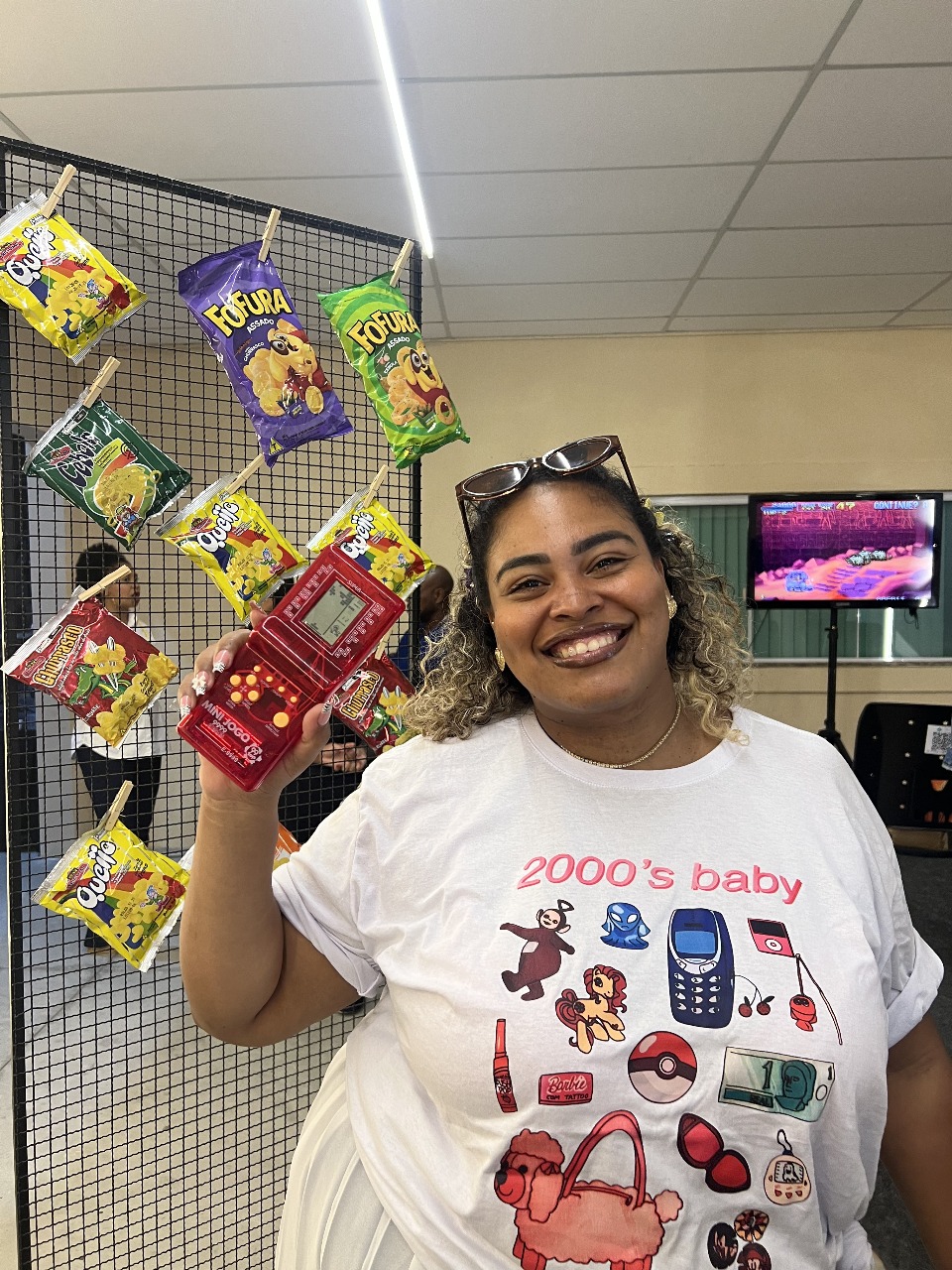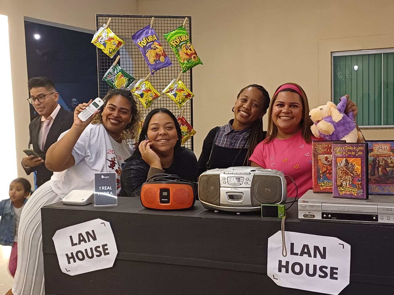 Logo ao chegar, os participantes foram surpreendidos por uma decoração nostálgica e envolvente. Amarelinha desenhada no chão, telefones antigos, videocassetes, videogames clássicos e acessórios da década transportaram a igreja para uma era de simplicidade e conexão.